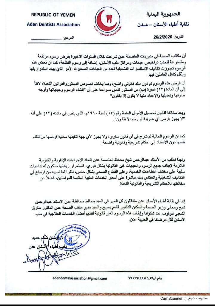 أصدرت نقابة أطباء الأسنان في العاصمة عدن بياناً رسمياً طالبت فيه السلطات المحلية والجهات الحكومية بالتدخل العاجل لوقف ما أسمته بـ “الرسوم المرتفعة وغير القانونية” التي فرضتها مكاتب الصحة في مديريات العاصمة مؤخراً.