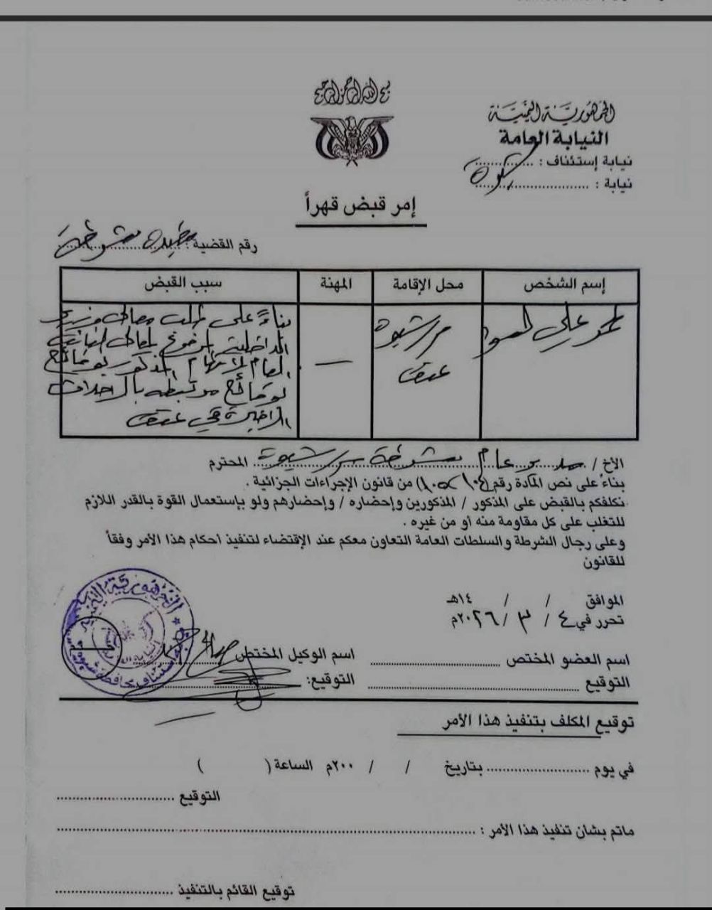 أصدرت النيابة العامة في محافظة شبوة أمرًا بالقبض القهري بحق لحمر علي لسود، رئيس فرع المجلس الانتقالي
