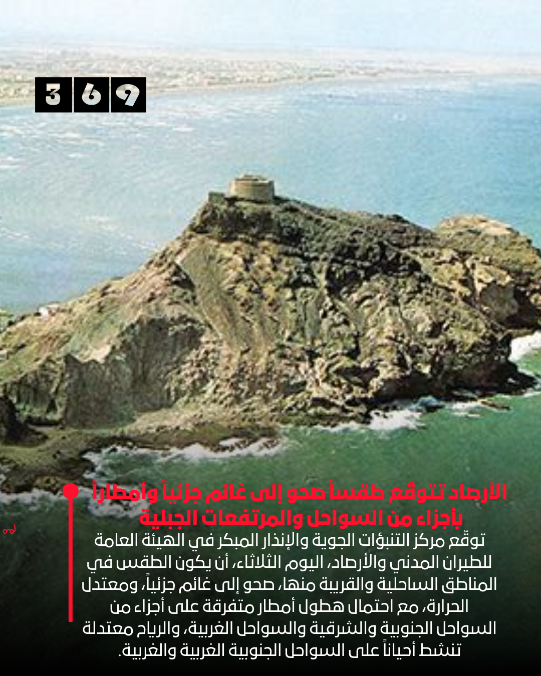 توقع المركز الوطني للأرصاد والإنذار المبكر هطول أمطار على المرتفعات الجبلية واضطراب البحر جنوب الساحل الغربي ومدخل باب المندب خلال الـ 24 ساعة المقبلة.