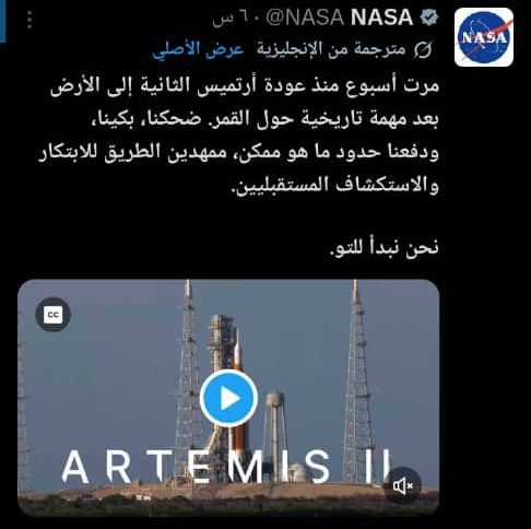أعلنت ناسا مرور أسبوع واحد (في تاريخ 17 أبريل 2026) على عودة طاقم مهمة “أرتميس 2” بسلام إلى كوكب الأرض بعد إتمام مهمة تاريخية داروا خلالها حول القمر