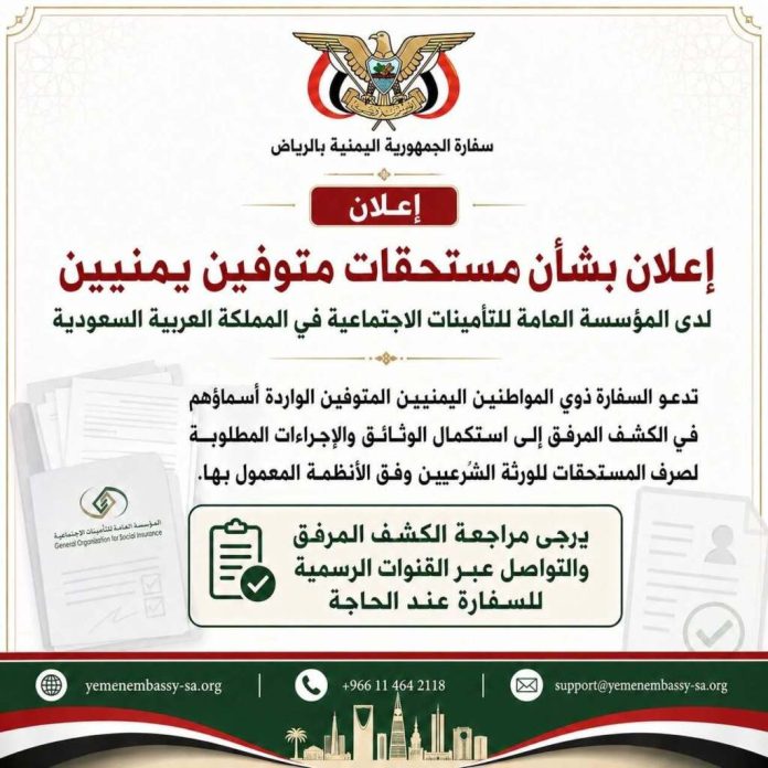 أعلنت السفارة اليمنية في الرياض عن وجود أكثر من 100 مواطن يمني متوفين، لديهم مستحقات تأمينية لم تُصرف بعد لورثتهم الشرعيين، داعية ذويهم إلى سرعة استكمال الإجراءات اللازمة للحصول عليها.