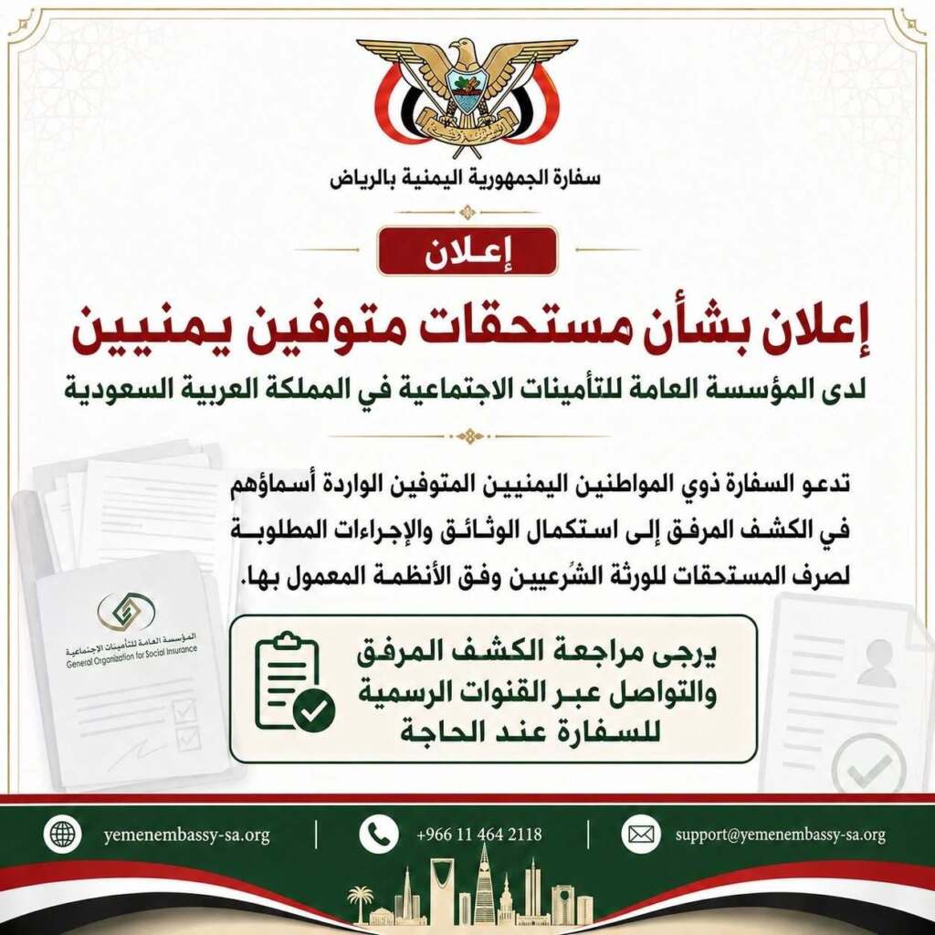 ودعت السفارة ذوي المتوفين إلى مراجعة الكشوفات واستكمال الوثائق المطلوبة عبر القنوات الرسمية للمؤسسة، أو التواصل مع السفارة للحصول على الإرشادات اللازمة، بما يضمن حفظ حقوق الورثة وتسريع إجراءات الصرف وفق الأنظمة المعمول بها.